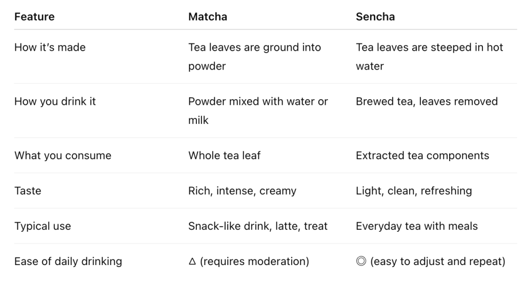 Both matcha and sencha come from the same tea plant, but they are used very differently in daily life.